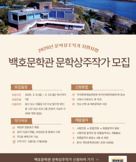 2026-03-24백호문학관에 상주하며 시민 대상 문학프로그램을 운영할 작가를 모집하니, 역량있는 문인..